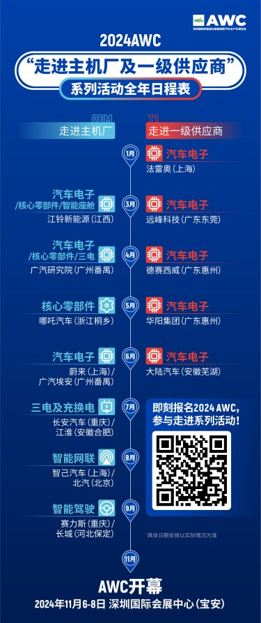 2023年,AWC已成功举办了四场“走进主机厂”系列活动,赢得了广泛好评。鉴于2024年更为广阔的产业需求以及技术的不断快速迭代更新,主办方顺势而为,再次升级并推出了“AWC走进主机厂及一级供应商系列活动”,亮点纷呈。