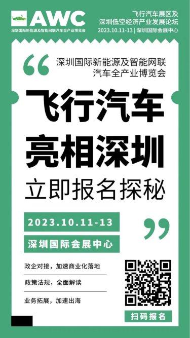AWC 2023 由深圳市工业和信息化局指导,励展博览集团主办,将于2023年10月11-13日在深圳国际会展中心盛大开幕,展会特设“飞行汽车”展区,并配套举办“深圳低空经济产业发展论坛”,助力“飞行汽车”的商业化落地及多场景应用。