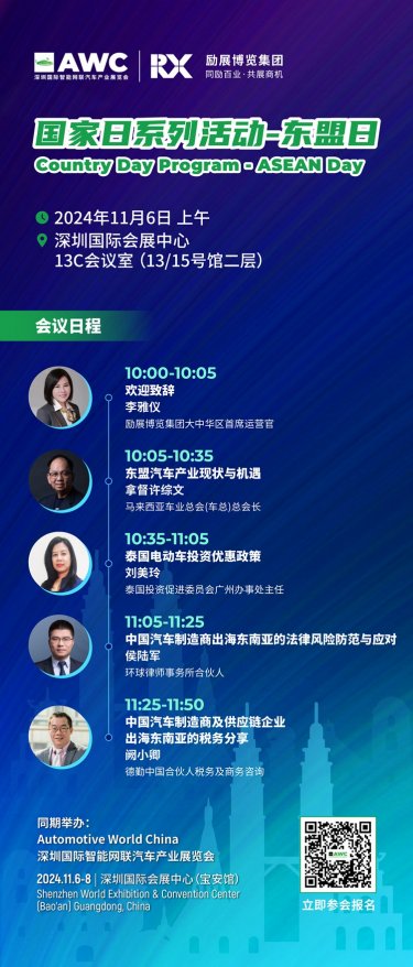 本次活动将汇聚多位重磅嘉宾,包括马来西亚车业总会总会长及泰国、印尼领事馆代表,深入剖析东盟汽车产业的现状与投资机遇。此外,活动还将邀请法律与税务专家,为中国企业解读出海东南亚的法律政策与税务策略,助力企业抓住东盟市场的巨大商机。