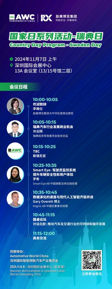 瑞典日将关注可持续发展,分享北欧汽车供应链的创新解决方案,探讨脱碳趋势。东盟日及马来西亚投资研讨会聚焦新能源汽车与智能网联技术,探讨合作机遇、投资及政策法规。