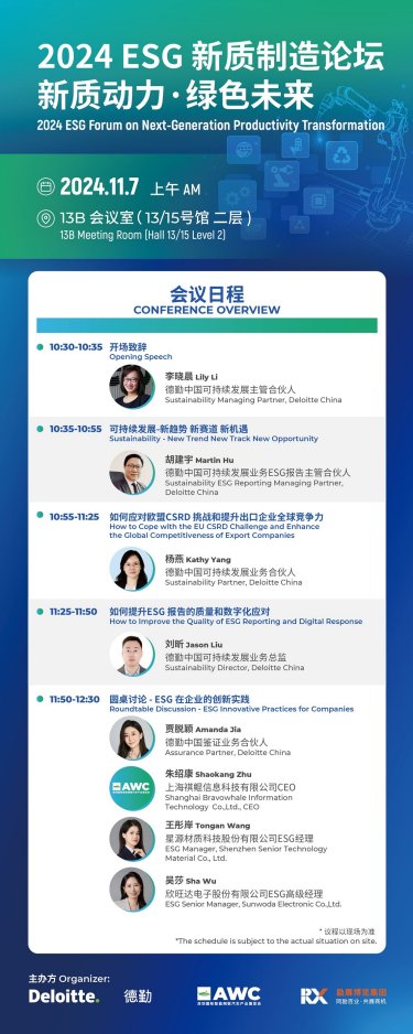 为应对这些挑战,励展博览集团将携手德勤于2024年11月7日上午在深圳国际会展中心13B会议室(13/15号馆二层)举办“2024 ESG新质制造论坛-新质动力·绿色未来”。