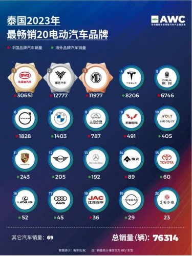 2023年泰国纯电动汽车,总计销量76314辆,比上年增长684.4% ,占该年新车注册总数的12.02%。其中在销量上,比亚迪为30651辆,占据1/4销量,第二位哪吒V的 12777辆,占比16.7%,第三位则是名爵的11977辆,以上三款车型共贡献了泰国2023年纯电汽车50%以上的销量。