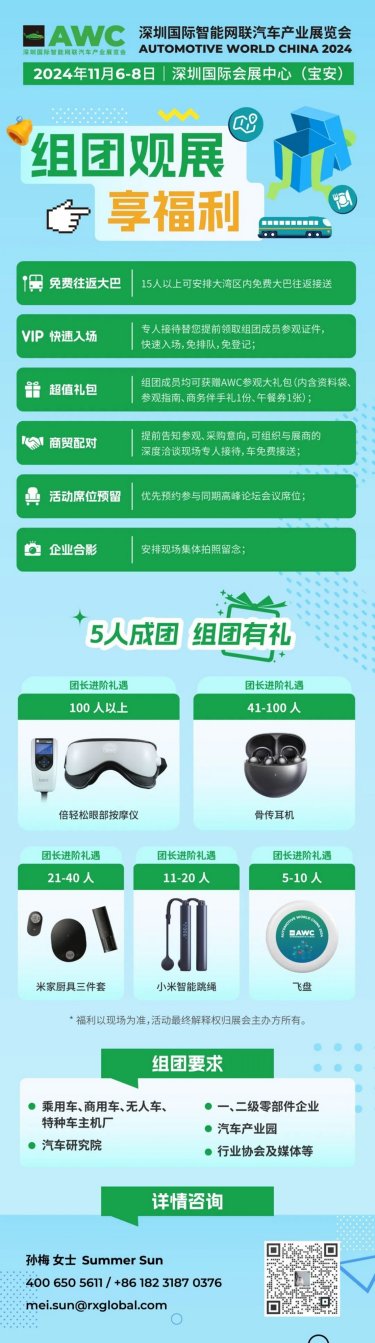 AWC诚挚邀请各车企、研究院、供应商、产业园、协会及媒体等汽车行业机构团体莅临参观,共探行业动态,领略前沿技术。我们专注打造卓越团体参观体验,优化流程,强化互动,旨在提升参访效率与价值。组团观展尽享便利,更有丰厚福利,期待您的加入,共绘汽车未来新篇章。