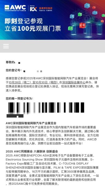 AWC深圳国际智能网联汽车产业展览会作为国内智能汽车前装市场的重要盛会,将于10月28-30日深圳国际会展中心举办。国内智能汽车前装市场的重要盛会,集中展示海内外先进技术、核心零部件及创新解决方案,通过精心策划高端商务对接、专业论坛、黑科技体验活动,全方位助您破解技术瓶颈,优化供应链,打造具备竞争力的产品。提前预登记立省100元