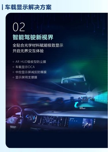 关键词:智能座舱、车载激光投影、Mini LED背板、中控模组、木纹屏、车载贴合OCA、智能变色调光导电膜、车载3D玻璃