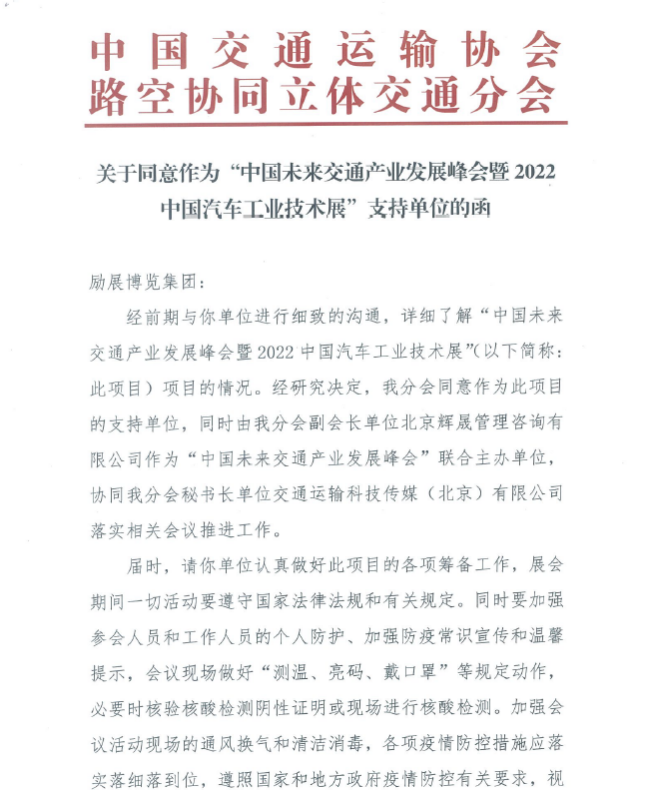 重磅消息!近日,中国交通运输协会路空协同立体交通分会同意作为10月12日-14日在深圳国际会展中心举办的“中国未来交通产业发展峰会暨中国汽车工业技术展AWC”的支持单位。