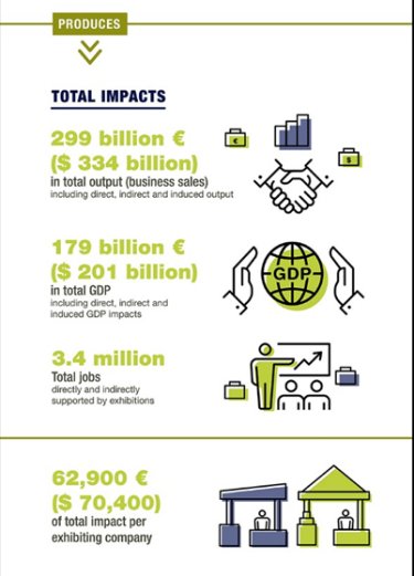 此外,观众和参展商产生的相关参观参展费用总计达2990亿欧元(3340亿美元),对会展业价值链(组织者、场馆和服务提供商)和相关旅游活动(住宿、餐饮和旅游)也影响重大。
