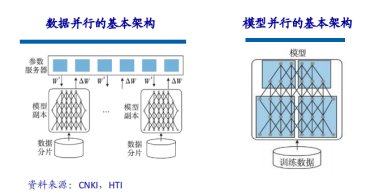 当训练的模型规模比较大时,可以通过数据并行的方法来加速模型的训练,数据并行可以对训练数据做切分,同时采用多个模型实例对多个分块的数据同时进行训练。在数据并行的实现中,由于是采用同样的模型、不同的数据进行训练,影响模型性能的瓶颈在于多CPU或多GPU间的参数交换。根据参数更新公式,需要将所有模型计算出的梯度提交到参数服务器并更新到相应参数上,所以数据片的划分以及与参数服务器的带宽可能会成为限制数据并行效率的瓶颈。