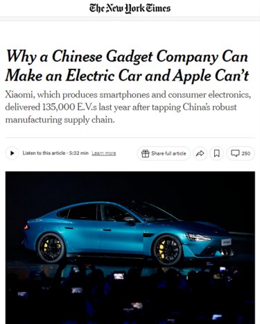 纽约时报:为什么小米能制造电动汽车,而苹果却做不到
