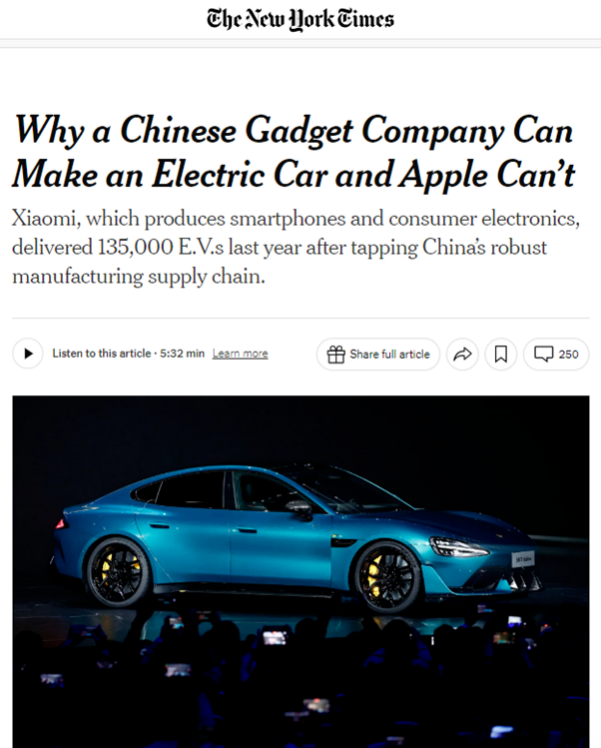 (谈思汽车讯)2月28日,《纽约时报》刊登了一篇名为《Why a Chinese Gadget Company Can Make an Electric Car and Apple Can’t》报道,报道探讨了小米为何能成功推出电动汽车,而苹果却未能实现这一目标,核心在于中国在电动汽车供应链上的主导地位。