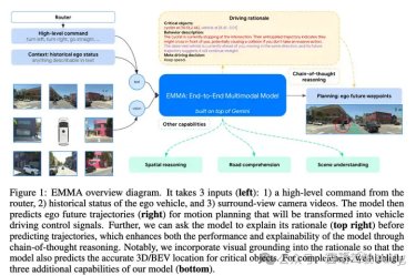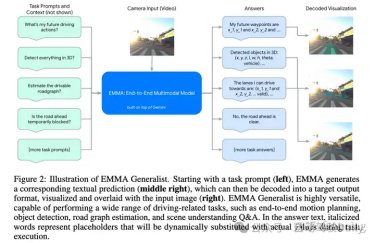 EMMA,这是一种由 Gemini 提供支持的端到端多模态自动驾驶模型。它将 Gemini 视为核心组件,并将自动驾驶任务重新构建为视觉问答问题,以适应 MLLM 的范式,旨在最大限度地利用 Gemini 的世界知识和配备思维链(COT)工具的推理能力。与传统模块化方案不同,EMMA 直接将原始摄像头传感器数据映射到各种特定于驾驶的输出,包括规划轨迹、感知目标和道路图估计。所有任务输出都表示为纯文本,因此可以通过特定任务的提示在统一的语言空间中联合处理。