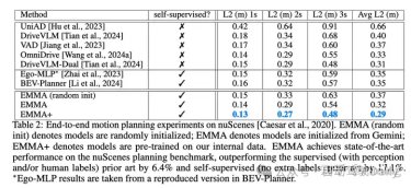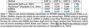 waymo在自己家的数据集刷了一遍,EMMA+对比EMMA其实就是预训练用了waymo内部数据集。这里wayformer之前是一个agent运动预测模型,这里修改成了用于预测自车未来轨迹的模型。