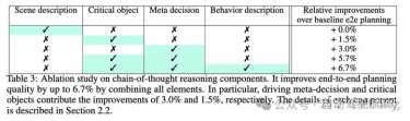 ablation里面思维链对最终e2e planning的影响,看起来是否添加R1的scene description对最终规划没有什么用,但是其他三个部分是有用的。