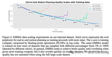 在内部数据集上的 EMMA 数据scaling实验。每条曲线都表示随着训练步骤的增加,端到端运动规划的 eval 困惑度。x 轴是训练计算,由对数刻度的浮点运算 (FLOP)(大模型scaling law中常用的度量指标), 相同的 EMMA 模型在四种大小的数据集上进行训练,这些数据集以从 3% 到 100% 的不同百分比