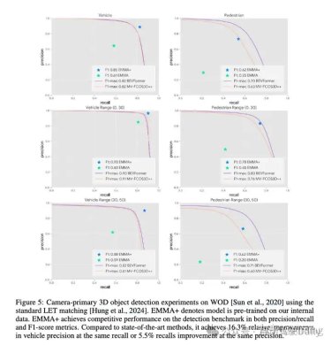 由于EMMA输出的检测框,没有置信度分数,因此直接比较精度/召回率,可以看见EMMA+的检测性能看起来还好,当然比较的都是一些很早期的3D检测器,个人猜测,VLA这种面向规划模型,3D感知性能有个大概还行的样子就够了