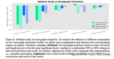 首先第一个部分:基于车道曲率和长度的道路图折线动态采样(最左侧)被证明是最重要的因素,导致车道级精度和召回率发生 70% 到 90% 的大幅变化。相比之下,将模型与类似语言的表示形式对齐,即语义标点符号(最右侧),效果变化不大,对任何指标的精度和召回率仅产生 <10% 的变化。