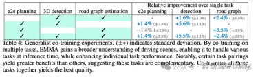 从三个任务来看:端到端规划、3D 目标检测、驾驶引导线预测。 所有三项任务的联合训练产生了较显著的改进,通才模型的性能比单任务模型高出 5.5%。