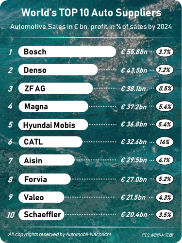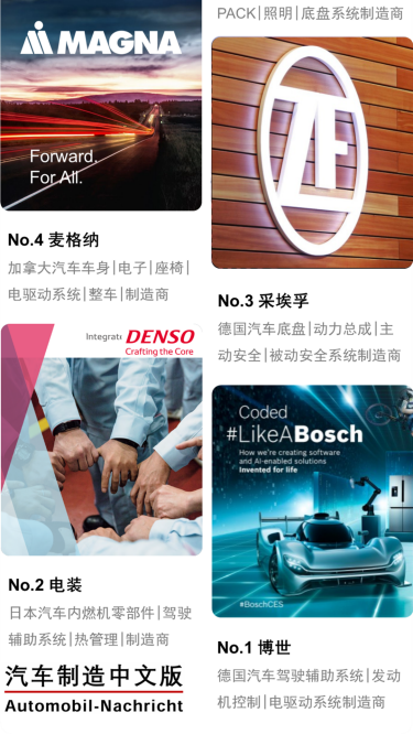 2024年,汽车行业风云变幻,新技术迭代并未因为市场的疲软而放慢脚步,各大零部件制造商特别是外资企业也卷起来了,老外们圣诞节加班早就不是新闻了。然而,汽车市场疲软却导致整车及零部件的价格战打得愈加惨烈,不少公司的利润却越来越薄,甚至面临接到业务即是亏损,不接业务则更亏损的境地。因此,为了让大家了解零部件行业的概貌,《汽车制造中文版》宵衣旰食、伏案良久,按去年全球各大零部件公司汽车业务销售额的高低,整理了排名前十家公司榜单,供业内人士参考。