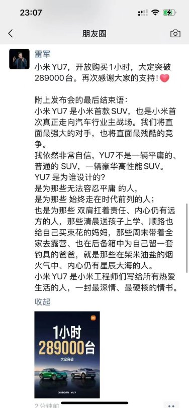 开放购买1小时,雷军在朋友圈激动地宣布,小米YU7大定突破28.9万台!