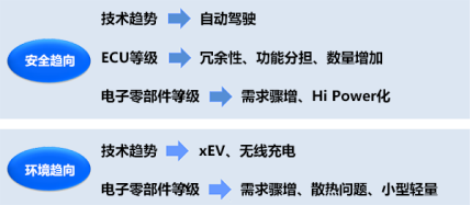 市场需求要求汽车往安全性和节能性发展。安全性是通过机械的自动化、ECU的冗余性、功能分担来实现的。另外,由于xEV的普及,增加了对xEV使用环境的需求。因此ECU的使用数量有增加,电子零部件需求也随之增长,对于提高零部件的可靠性,小型、高性能化的要求越来越多。