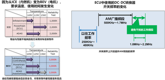 伴随着xEV、自动驾驶的普及,车载零部件的可靠性要求逐步发生变化。汽车从ICE(内燃机)变为了BEV(电机),其内部发热源(内燃机)逐步被替代,内部工作环境温度也随之降低,另一方面,伴随着自动驾驶的普及,汽车的使用时间可能会延长。根据功能不同,零部件要求的工作环境温度也有所差异,预计可靠性的要求时间会提高到3000小时。另外,为了稳定电池的电压,ECU必须搭载DC-DC转换器,并且因为EMI噪音问题,开关频率逐渐上升到1.8-2.2MHz来避开AM频段。