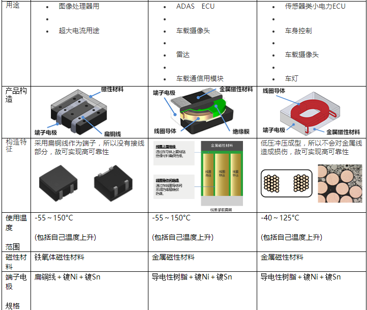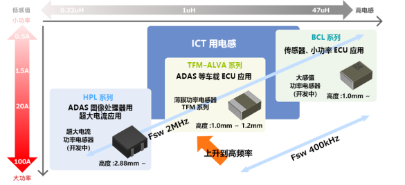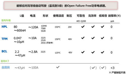 与以前相比,HPL、TFM、BCL系列是为实现level5自动驾驶,降低了故障风险的高可靠性车载用高频率功率电感器。与面向ICT的金属类功率电感器相比,在耐压、可靠性方面改良了特性,HPL系列覆盖大电流低电感范围,BCL系列覆盖高电感低电流范围,TFM系列覆盖两者之间的范围,形成了一个产品系列。