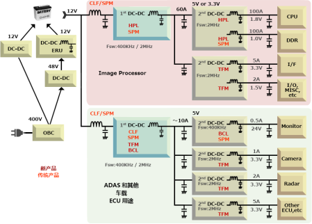 图6是一个车载电源电路的例子,显示了ECU内DC-DC变换器的1次电路、2次电路中电感的使用情况,2次电路的开关频率逐渐达到2MHz左右。高可靠性车载用高频率功率电感器的HPL、TFM、BCL系列可提供解决方案。