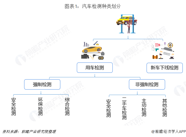 目前汽车检测主要可以分为强制性检测和非强制性检测,强制性检测包括安全、环保、综合检测;非强制性检测主要包括维修检测、二手车检测、车主主动检测等。