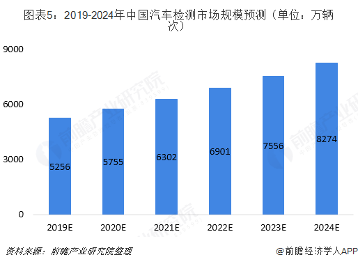 汽车保有量的迅速增长直接带动了汽车检测量的提升,按照汽车拥有量20%的检测量作为统计依据, 2019年,预计我国汽车检测量将超过5200万辆次;到2024年,汽车检测的市场规模将超过8000万辆次。