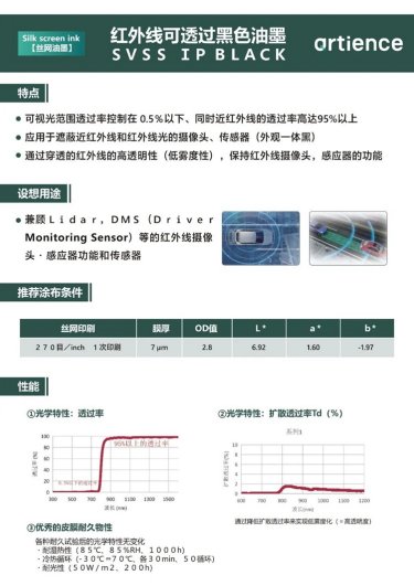 展品性能特点:可视光范围透过率控制在 0.5%以下、同时近红外线的透过率高达95%以上应用于遮蔽近红外线和红外线光的摄像头、传感器(外观一体黑)通过穿透的红外线的高透明性(低雾度性),保持红外线摄像头,感应器的功能。