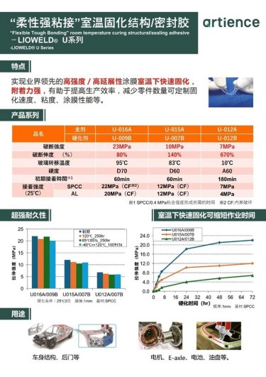 展品性能特点:实现业界领先的高强度/高延展性涂膜室温下快速固化,附着力强,有助于提高生产效率,减少零件数量可定制固化速度、粘度、涂膜性能等应用于车身结构,电机、E-axle、电池、油盘等。