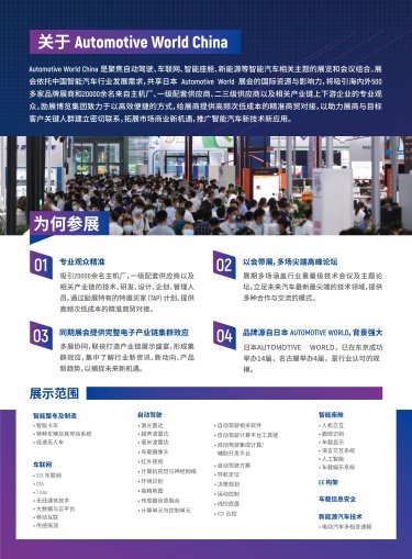 AWC展会聚焦智能汽车先进技术、核心零部件及解决方案等产品展示,致力于提供精准买家对接人脉扩充、政企对接、国际业务开拓等一站式交钥匙服务,全方位助力企业在全球化汽车市场中蓬勃发展!