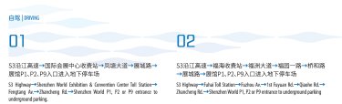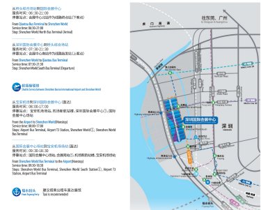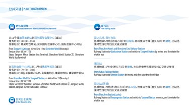 穿梭巴士:配备智慧公交,接驳地铁11号线塘尾站和机场,在展馆和周边的地铁站、巴士场站、商业中心区、酒店等地往返。